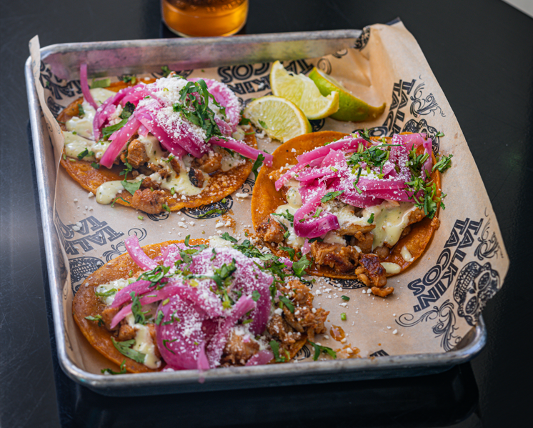 Chicken Achiote Tacos: Corn Tortilla, Achiote Chicken Thigh, Avocado Salsa, Pickled Onions, Cotija Cheese, and Cilantro.