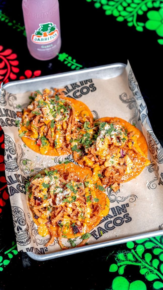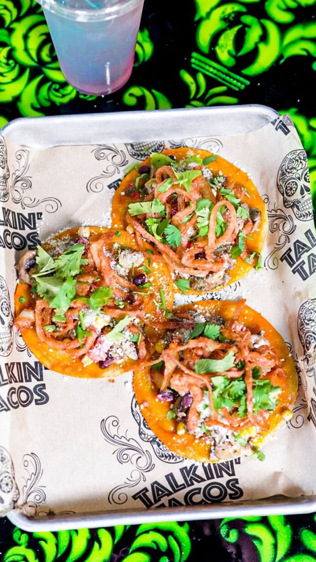 Hongos Tacos: Sautéed Portobello Mushrooms, Garlic, Thyme, and Rosemary, Black Bean Salsa, Pico de Gallo, Crispy Onions, Salsa Verde, and Cilantro.