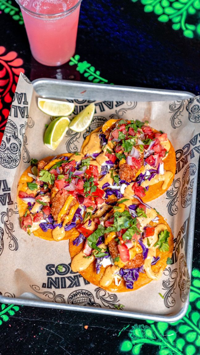 Mahi Mahi Tacos: Corn Tortilla, Red Cabbage, Avocado Salsa, Crispy Mahi, Spicy Mayo, Pico de Gallo, and Cilantro.