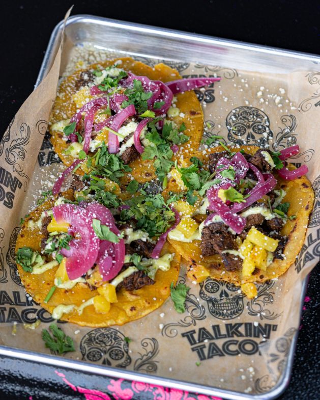 Steak Al Pastor Tacos: Corn Tortilla, Marinated Steak, Pineapple, Pickled Onion, Avocado Salsa, Cotija Cheese, and Cilantro.