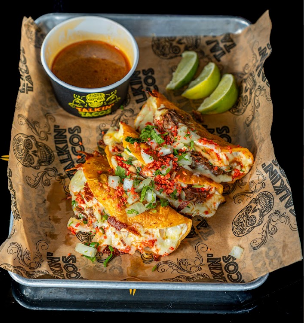 Birria Taki Tacos: Corn Tortilla, Chihuahua Cheese, Birria, Onion, Cilantro, Cheese Sauce, Takis, and Consommé.